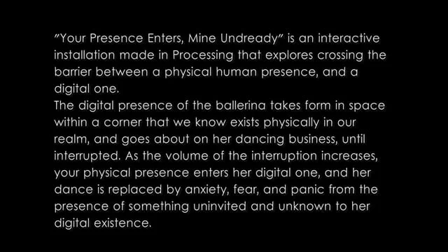 is an Interactive Installation which explores crossing the barrier between physical and digital presence, and the sense of fear when privacy is breached.